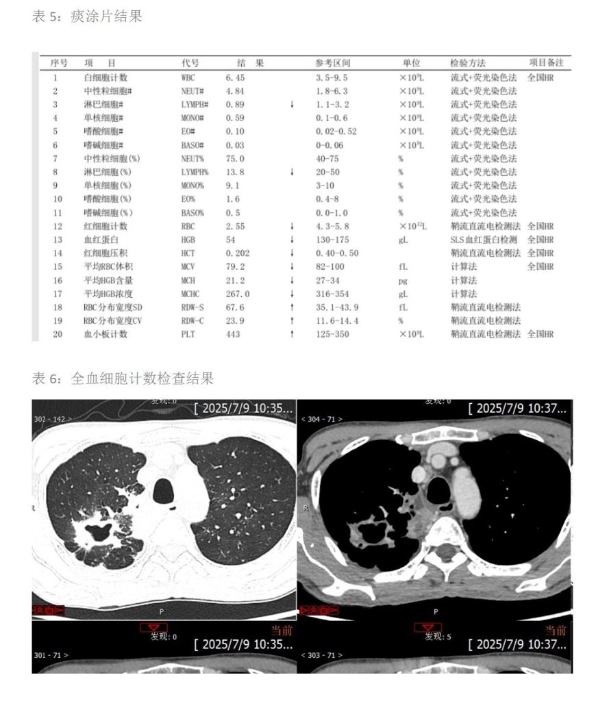 病后至当地诊所,予头孢、阿莫西林抗感染及退热、止咳化痰等治疗(具体治疗时长不详),热退后仍有反复发热,体温波动于 38-39℃之间。近期体重下降 7kg,为进一步诊治来我院门诊就诊,随后收入院。入院后完善血常规、炎症指标、胸部影像学等相关检查。